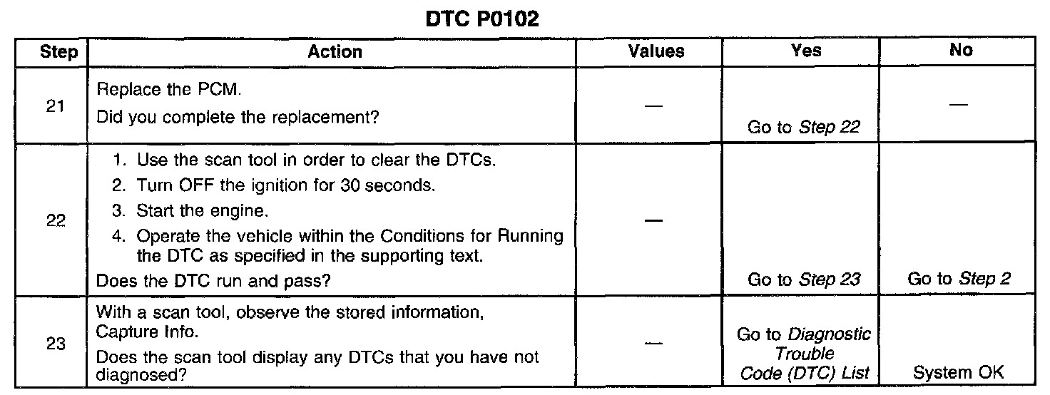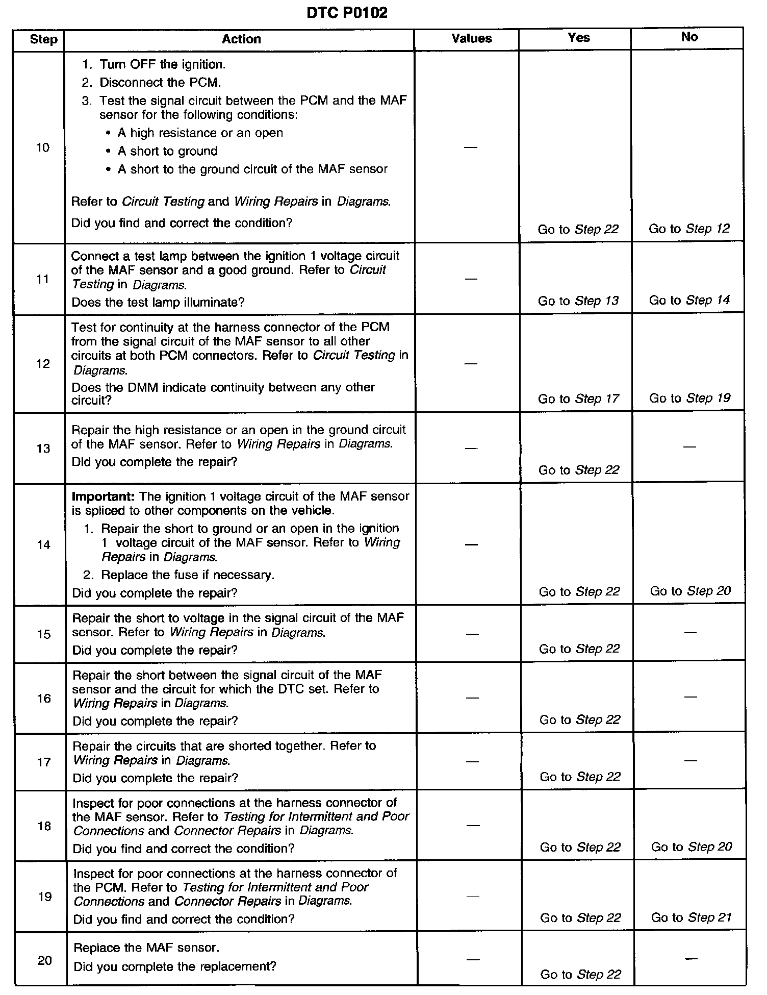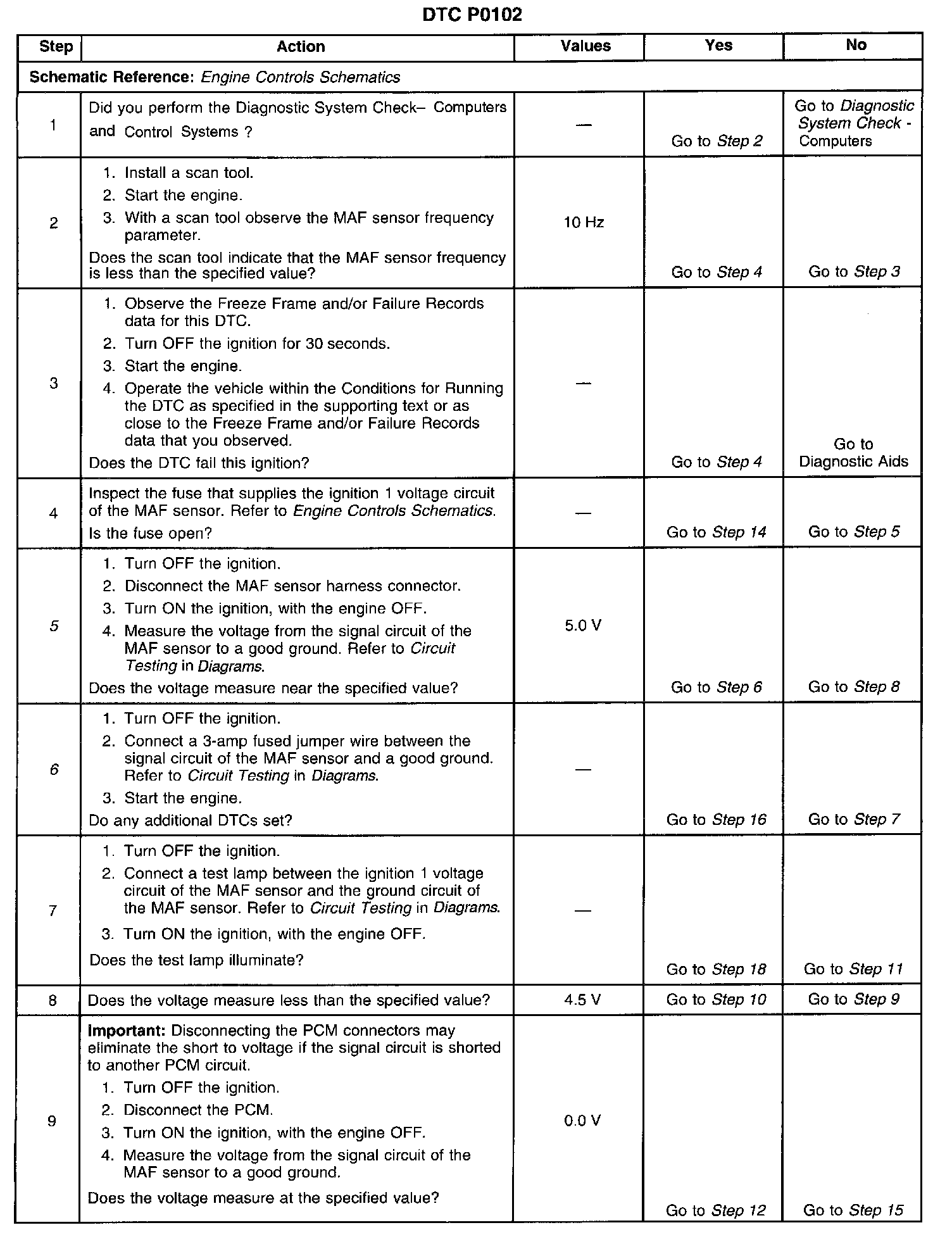 CIRCUIT DESCRIPTIONThe Mass Air Flow (MAF) sensor is an air flow meter that measures the amount of air entering the engine. The (PCM) uses the MAF sensor frequency signal in order to provide the correct fuel delivery for a wide range of engine speeds and loads. A small quantity of air entering the engine indicates deceleration or idle. A large quantity of air entering the engine indicates an acceleration or high load situation. The MAF sensor has an ignition 1 voltage circuit, a ground circuit and a signal circuit. The PCM applies a voltage to the sensor on the signal circuit. The sensor uses the voltage in order to produce a frequency based on inlet air flow through the sensor bore. DTC P0102 will set if the PCM detects a frequency signal lower than the possible range of a normally operating MAF sensor