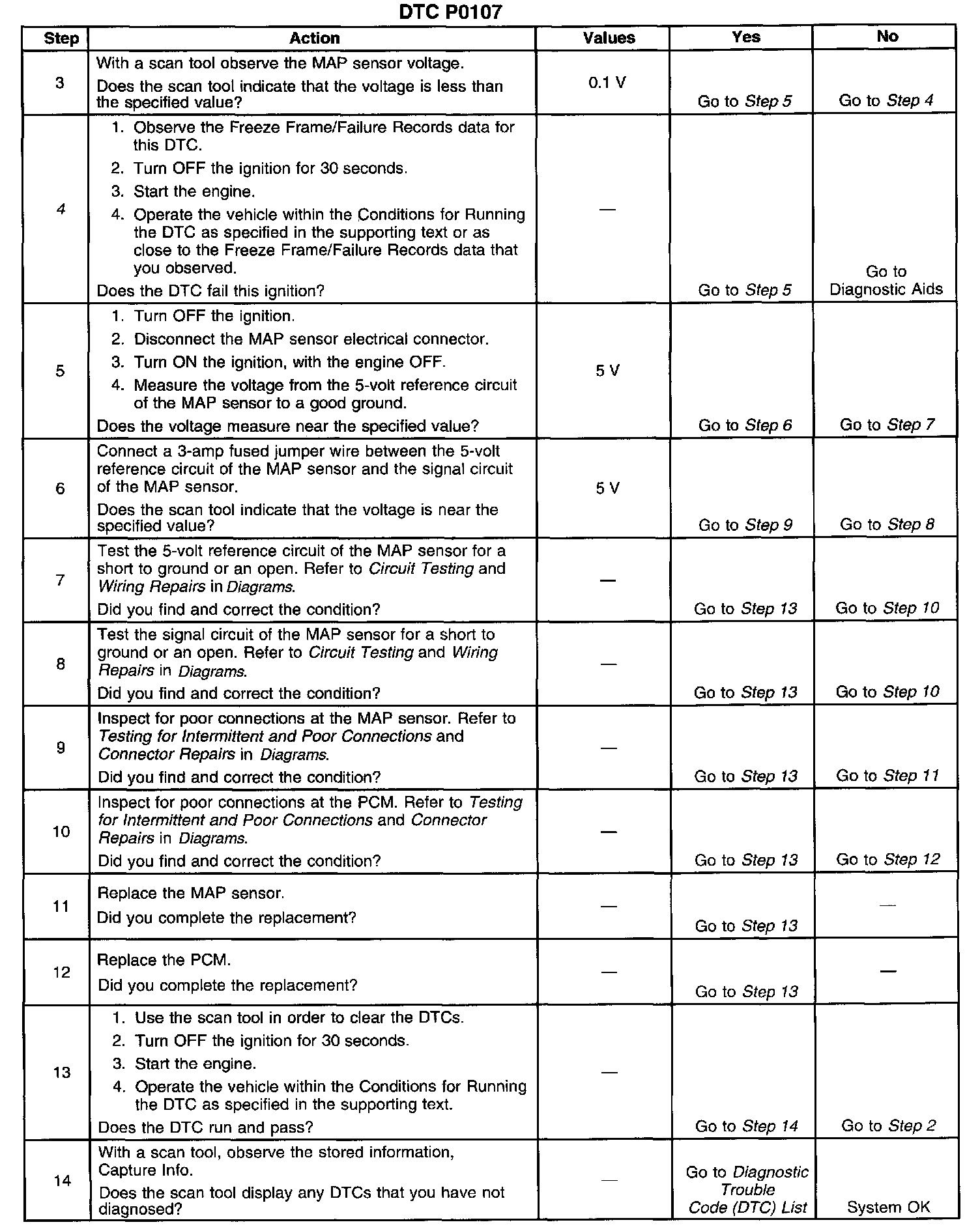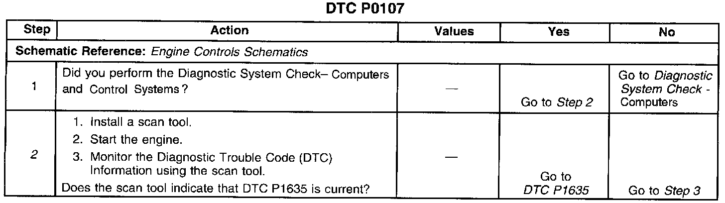 If the PCM detects a MAP sensor signal voltage that is excessively low, DTC P0107 will set.