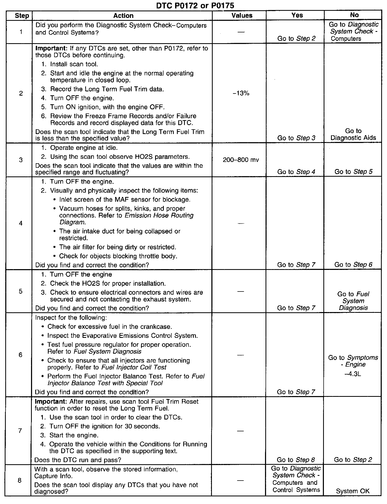 CIRCUIT DESCRIPTIONThe Powertrain Control Module (PCM) controls the air/fuel metering system in order to provide the best possible combination of driveability, fuel economy and emission control. Fuel delivery is controlled differently during open and closed loop. During open loop the PCM determines fuel delivery based on sensor signals, without oxygen sensor input. During closed loop, the oxygen sensor inputs are added and used by the PCM to calculate short and long term fuel trim (fuel delivery adjustments). If the oxygen sensors indicate a lean condition, fuel trim values will be above 0 percent. If the oxygen sensors indicate a rich condition, fuel trim values will be below 0 percent. Short Term fuel trim values change rapidly in response to the Heated Oxygen Sensor (HO2S) voltage signals. Long Term fuel trim makes coarse adjustments in order to maintain Air/Fuel Ratio of 14.7:1. The fuel trim diagnostic will conduct a test to determine if a rich failure actually exists or if excessive vapor from the Evaporative Emission (EVAP) canister is causing a rich condition. If the PCM detects an excessively rich condition, this DTC will set. If the PCM detects excessive vapor then a pass is logged.