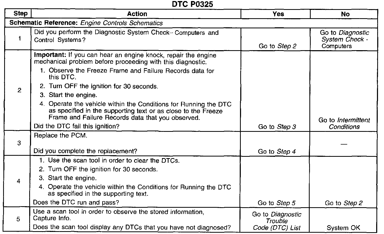 CIRCUIT DESCRIPTIONThe Knock Sensor (KS) produces an AC voltage at all engine speeds and loads. The Powertrain Control Module (PCM) then adjusts the spark timing based on the amplitude and frequency of the KS signal. The PCM uses the KS signal to calculate the average voltage. Then the PCM assigns a voltage value. The PCM checks the knock sensor and related wiring by comparing the actual knock signal to the assigned voltage range. A normal KS signal should stay within the assigned voltage range. This DTC will set if the PCM malfunctions in a manner that will not allow proper diagnosis of the KS system.