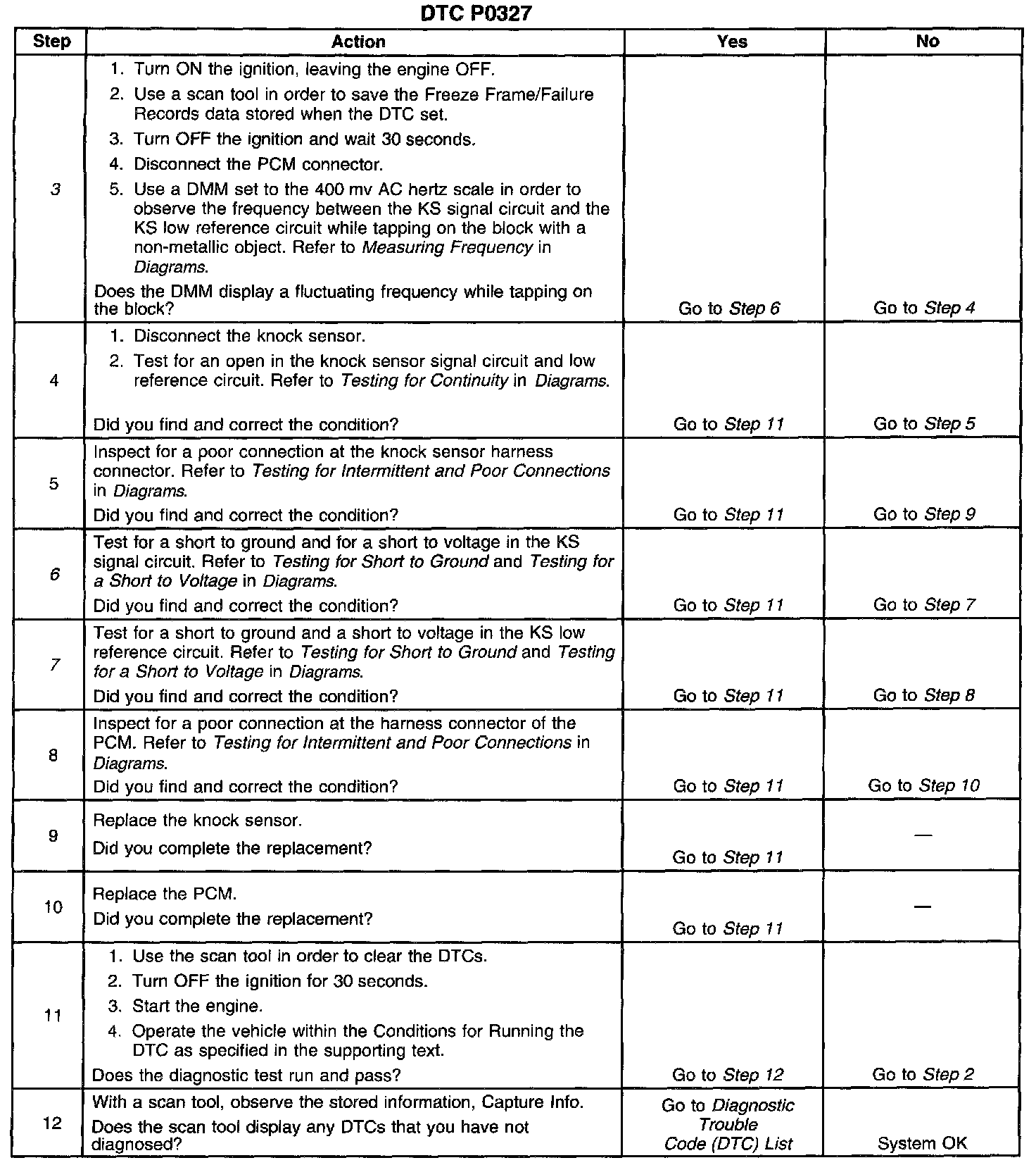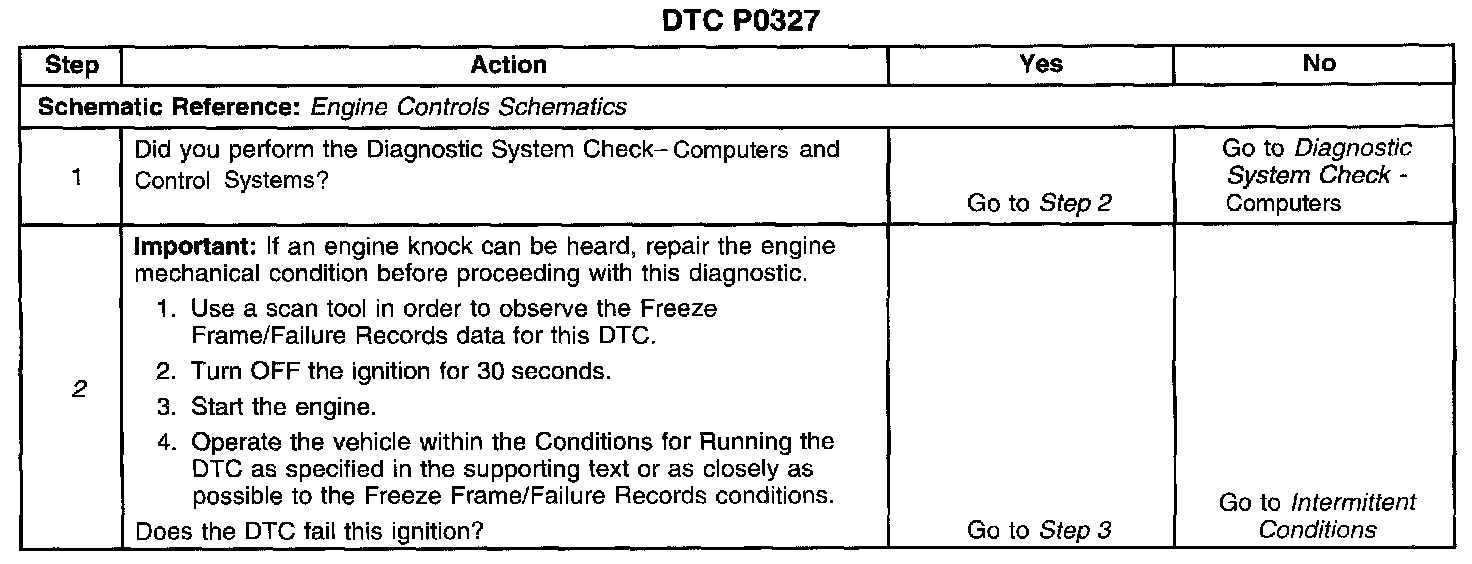 CIRCUIT DESCRIPTIONThe Knock Sensor (KS) produces an AC voltage at all engine speeds and loads. The Powertrain Control Module (PCM) adjusts the spark timing based on the amplitude and frequency of the KS signal. The Power Control Module (PCM) uses the KS signal in order to calculate the average voltage. The PCM assigns a voltage value. The PCM checks the knock sensor and the related wiring by comparing the actual knock signal to the assigned voltage range. A normal KS signal should stay within the assigned voltage range. This DTC will set if the KS signal is outside the assigned voltage range or if the signal is not present.