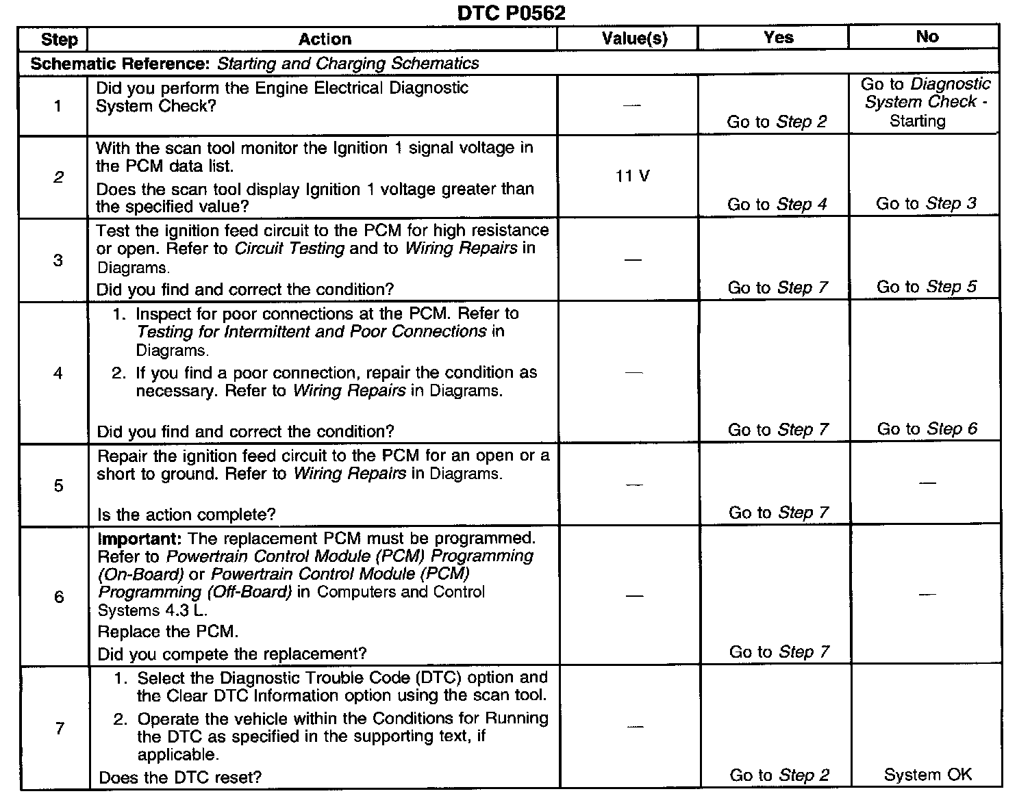 CIRCUIT DESCRIPTIONThe PCM monitors the system voltage to make sure that the voltage stays within the proper range. If the PCM detects an excessively low system voltage, DTC P0562 will set.