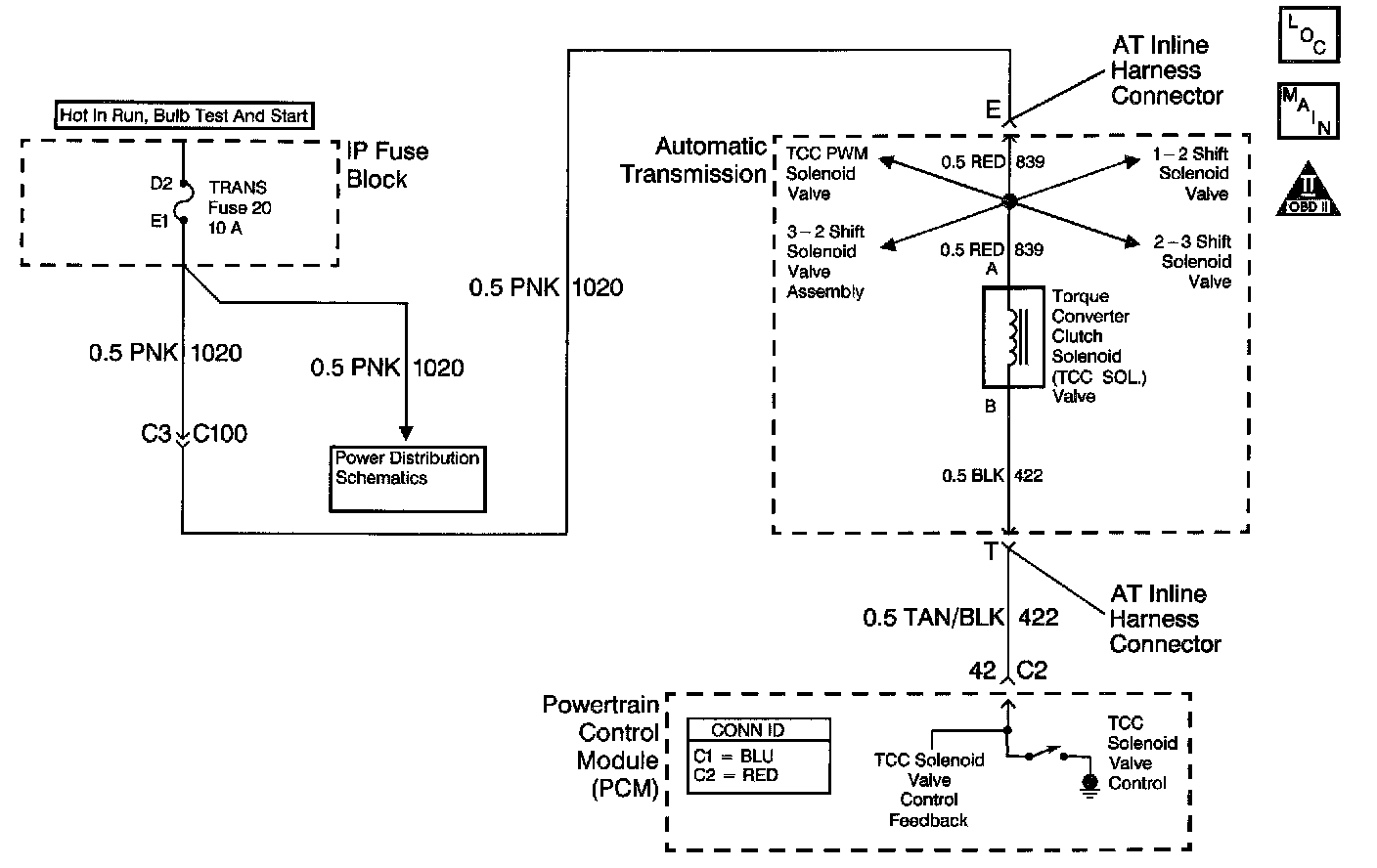 The Torque Converter Clutch (TCC) solenoid valve is an electrical device that is used with the Torque Converter Clutch Pulse Width Modulation (TCC PWM) solenoid valve in order to control TCC apply and release. The TCC solenoid valve attaches to the transmission case assembly extending into the pump cover. The TCC solenoid valve receives ignition voltage through the OFF/RUN/CRANK voltage circuit. The Powertrain Control Module (PCM) controls the solenoid by providing the ground path on the TCC solenoid valve control circuit. The PCM monitors the throttle position sensor voltage, the vehicle speed, and other inputs in order to determine when to energize the TCC solenoid valve.