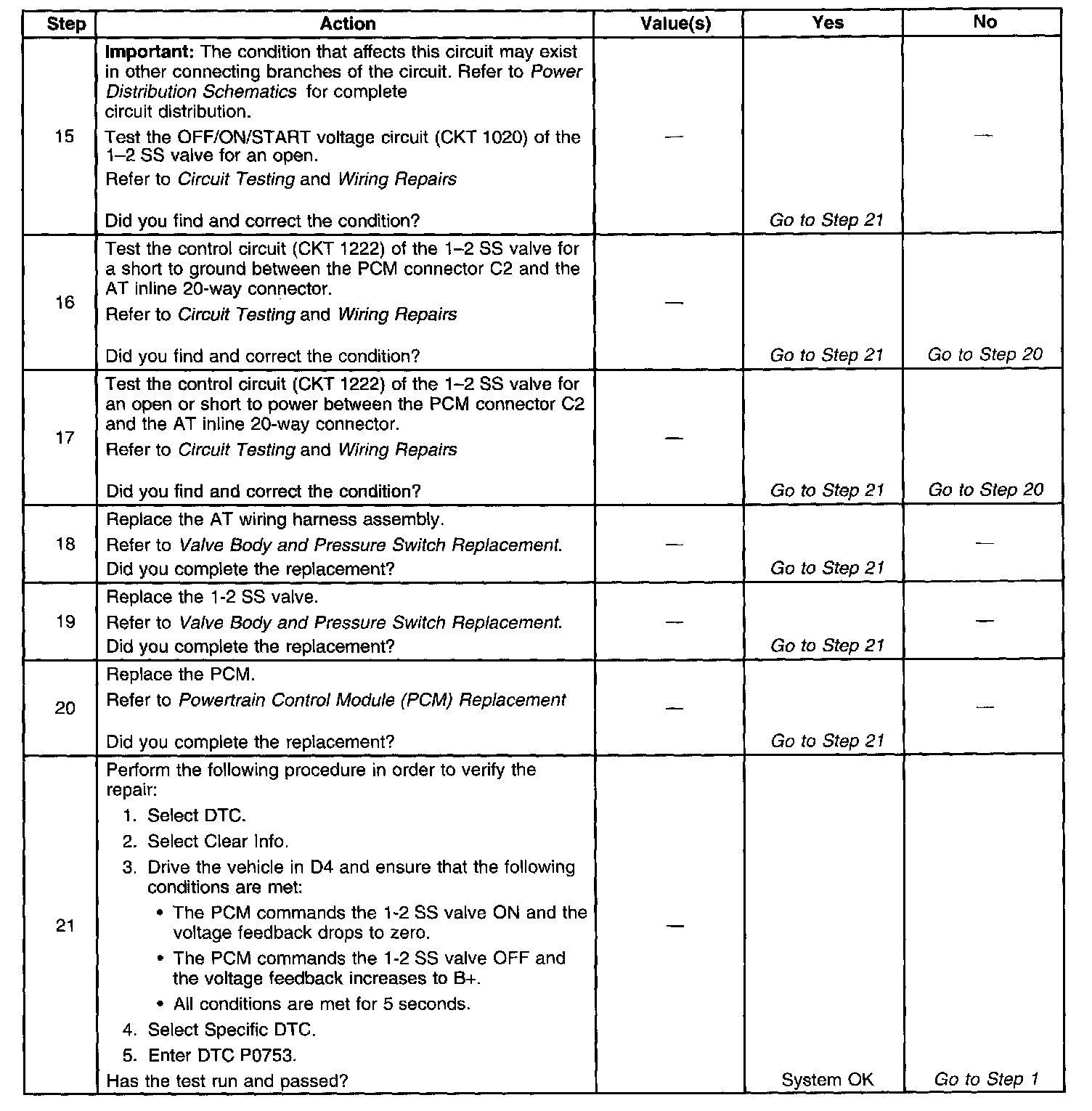 When the PCM detects a continuous open, short to ground or short to power in the 1-2 SS valve circuit, then DTC P0753 sets. DTC P0753 is a type B DTC.