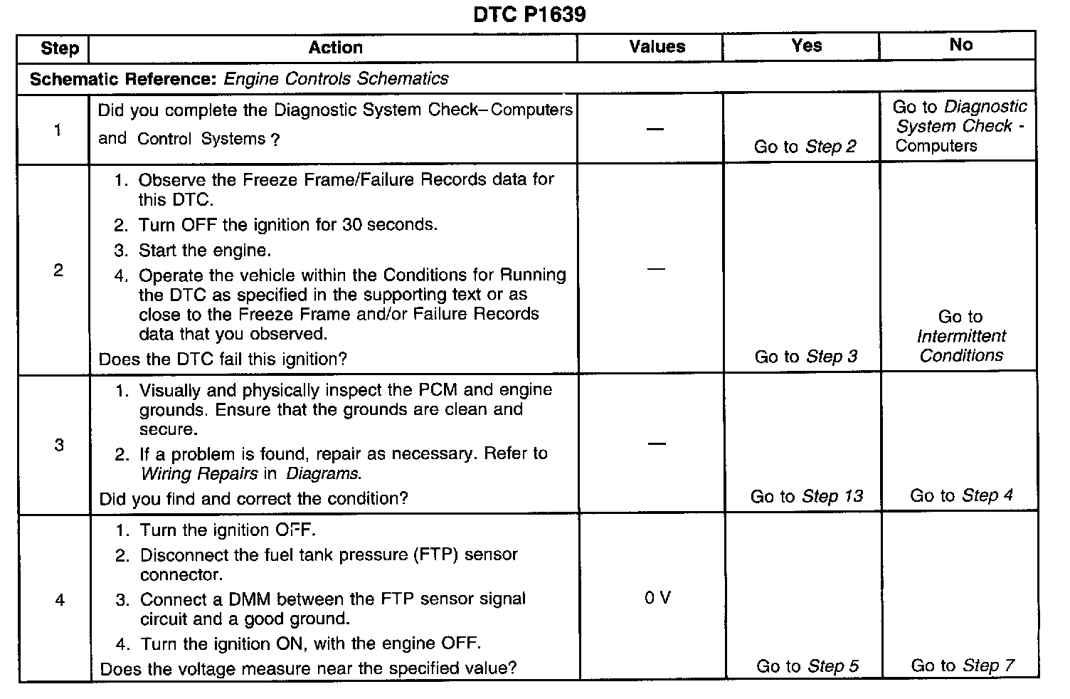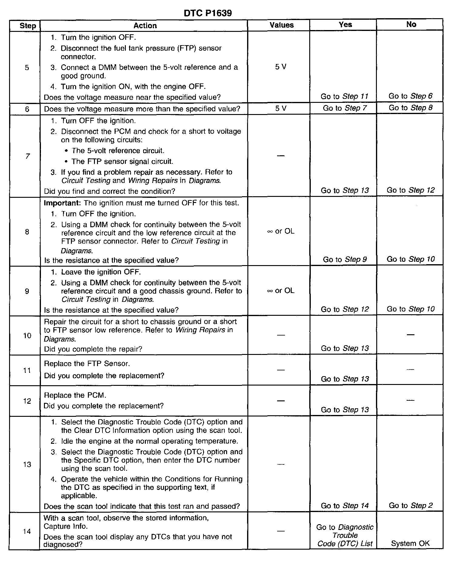 CIRCUIT DESCRIPTIONThe Powertrain Control Module (PCM) uses the 5-volt reference 2 circuit as a sensor feed for the Fuel Tank Pressure (FTP) sensor. The PCM monitors the voltage on the 5-volt reference 2 circuit. If the voltage is out of tolerance, the PCM will set DTC P1639.