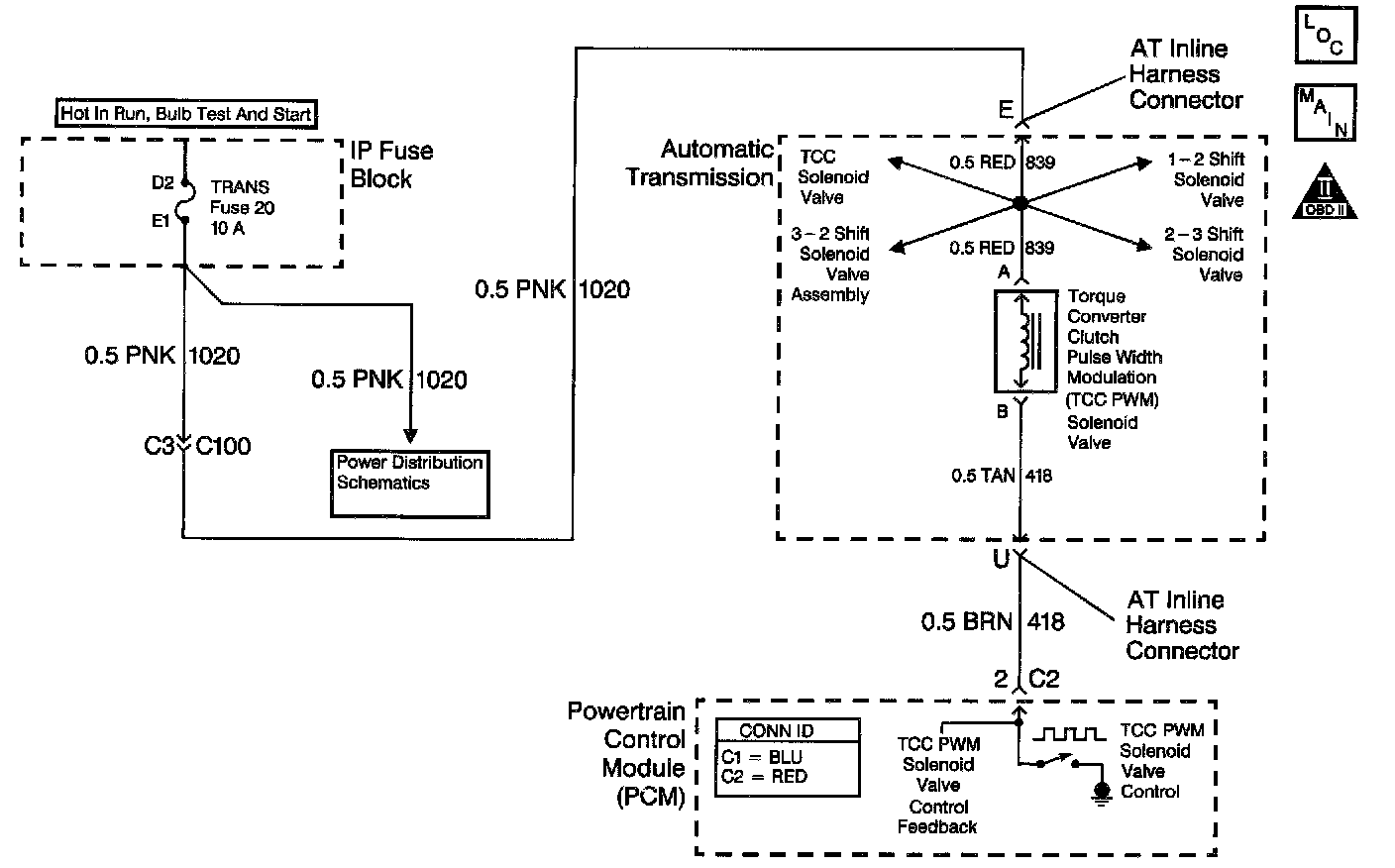The Torque Converter Clutch Pulse Width Modulation (TCC PWM) solenoid valve controls the fluid acting on the converter clutch valve. The converter clutch valve controls the TCC application and release. The solenoid attaches to the control valve body within the transmission. The solenoid receives ignition voltage through the OFF/ON/START voltage circuit. The Powertrain Control Module (PCM) controls the solenoid by providing a ground path on the TCC PWM solenoid valve control circuit. Current flows through the solenoid coil according to the duty cycle (percentage of ON and OFF time). The TCC PWM solenoid valve provides a smooth engagement of the TCC by operating during a duty cycle percent of ON time.
