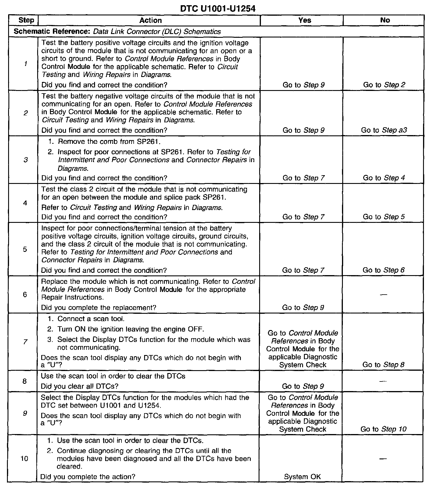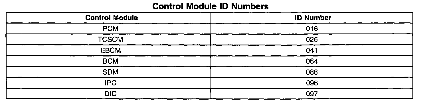 The control module ID number list provides a method for determining which module is not communicating. A module with an internal class 2 serial data circuit malfunction or which loses power during the current ignition cycle would have a lost communication DTC set by Other modules. Use the control module ID number list in order to determine which module is not communicating and the DTC U1001-U1254 diagnostic table in order to diagnose the malfunction.