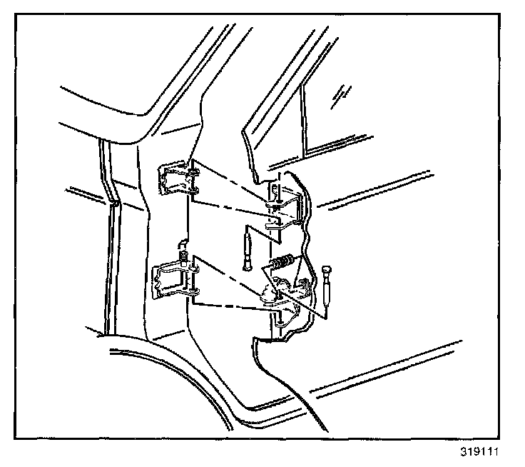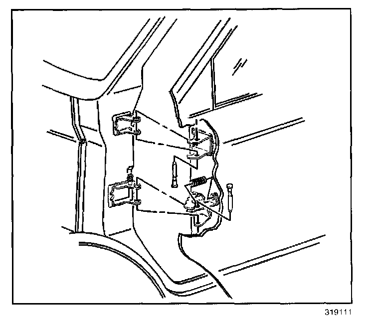 6. Install a temporary bolt through the lower hinge in order to hold the door in place while removing the upper hinge pin.