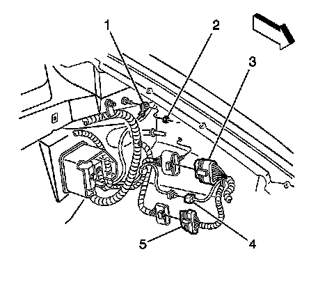 14. Disconnect the engine from the forward lamp harness connector (5).