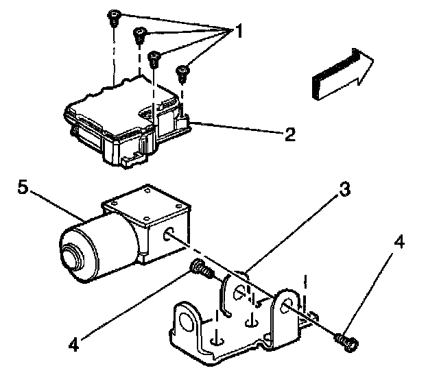 3. Remove the four T 25 Torx(R) mounting screws (1) that fasten the EBCM (2) to the BPMP (5).