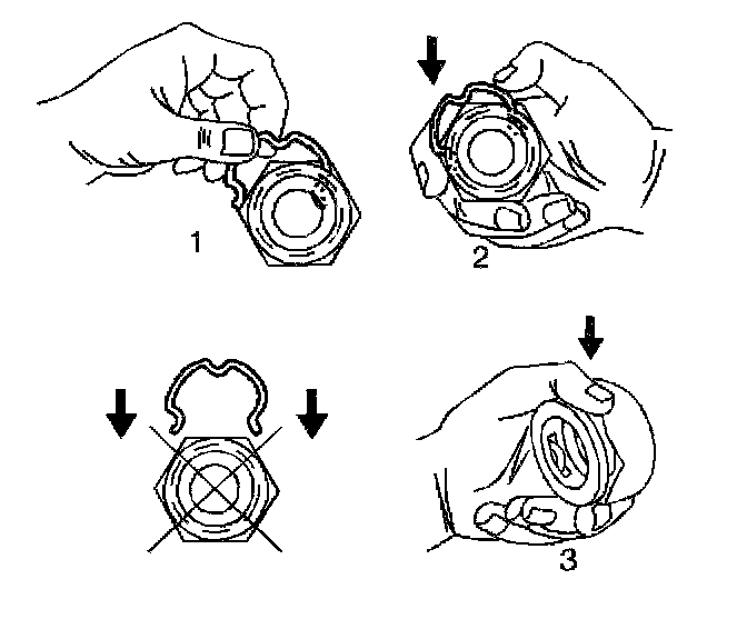 2.1. Using your thumb and forefinger, insert a new retaining clip into one of the three recesses in the connector fitting (1).