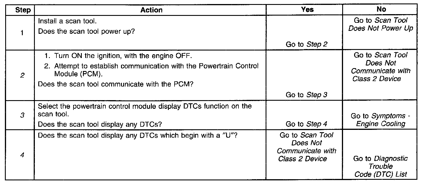 2. Lack of communication may be due to a partial malfunction of the class 2 serial data circuit or due to a total malfunction of the class 2 serial data circuit. The specified procedure will determine the particular condition.