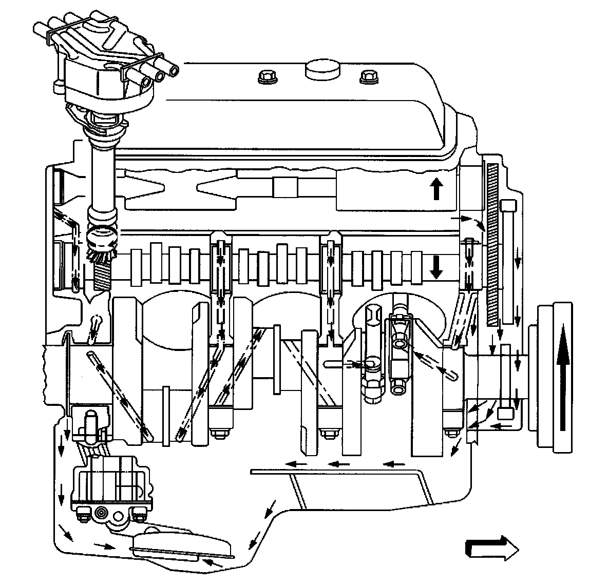 Full pressure lubrication, through a full-flow oil filter is supplied by a gear-type oil pump. Oil is drawn up through the oil pump screen and passes through the pump to the oil filter. The oil filter is a full-flow paper element unit with an anti-drain back valve. An oil filter bypass valve is used to ensure adequate oil supply, in the event the filter becomes plugged or develops excessive pressure drop. Filtered oil flows into the main gallery and then to the camshaft, the balance shaft, the rear bearing, and the crankshaft bearings. The valve lifter oil gallery supplies oil to the valve lifters. Oil flows from the valve lifters; through the hollow valve pushrods to the valve rocker arms. Oil drains back to the crankcase through the oil drain holes in the cylinder head. The camshaft timing chain is drip fed from the front camshaft bearing. The pistons and piston pins are lubricated by oil splash.