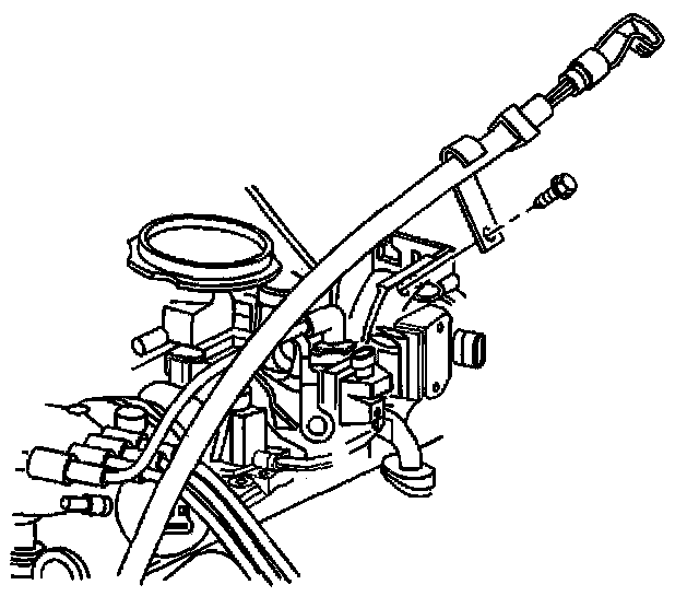 22. Remove the bolt holding the transmission fluid filler tube to the accelerator control cable bracket.