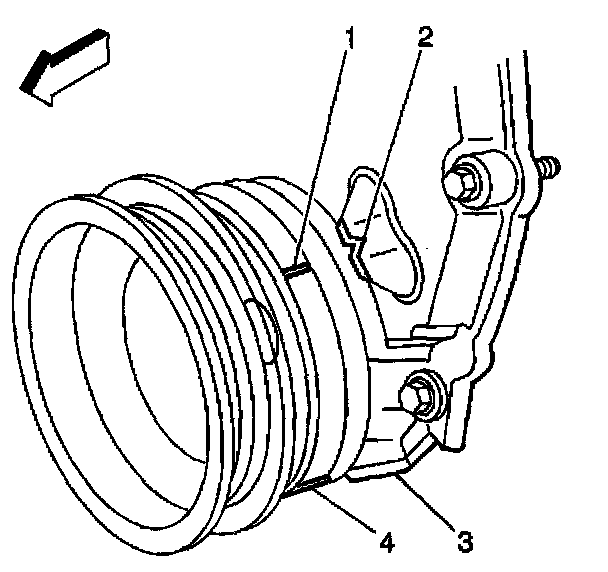 12. Align the 2 reference marks on the crankshaft balancer (1,4) with the 2 alignment marks (2,3) on the front cover.