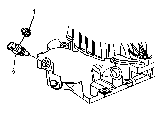 12. Remove the Engine Coolant Temperature (ECT) sensor plug (1) or the ECT sensor (2) from the front of the lower intake manifold (if equipped).