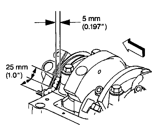 2. Apply a 5 mm (0.197 inch) wide and 25 mm (1.0 inch) long bead of adhesive GM P/N 12346141 or equivalent to both the right and left sides of the crankshaft rear oil seal housing to engine block junction at the oil pan sealing surfaces.