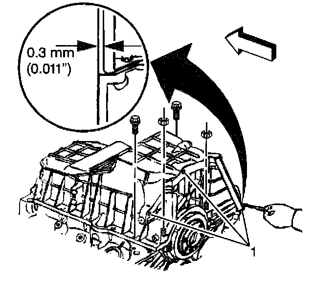 Use a feeler gauge to check the clearance between the oil pan-to-transmission housing measurement points. If the clearance exceeds 0.3 mm (0.011 inch) at any of the 3 oil pan-to-transmission housing measurement points (1), then repeat the step until the oil pan-to-transmission housing clearance is within the specification. The oil pan must always be forward of the rear face of the engine block.