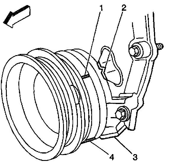 5. Rotate the crankshaft balancer to position the crankshaft balancer alignment mark (1) 57-63 degrees clockwise or counterclockwise from the engine front cover alignment tab (2).