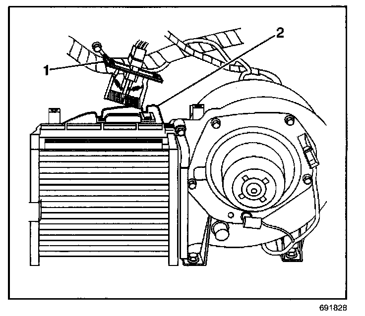 4. Remove the auxiliary heater blower motor resistor assembly (1) from the heater case.