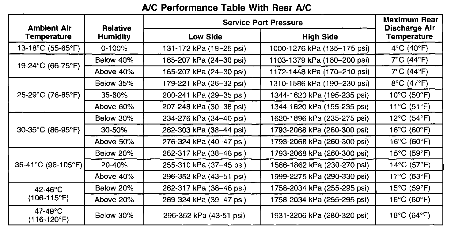 A/C Performance Table With Rear A/C: