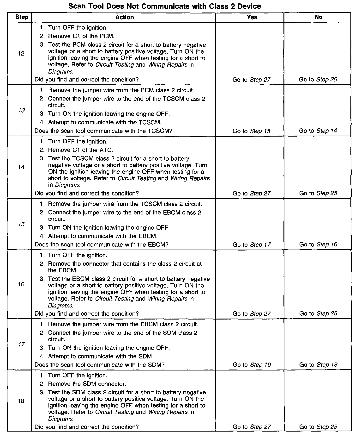 2. A partial malfunction in the class 2 serial data circuit uses a different procedure from a total malfunction of the class 2 serial data circuit. The following modules communicate on the class 2 serial data circuit: