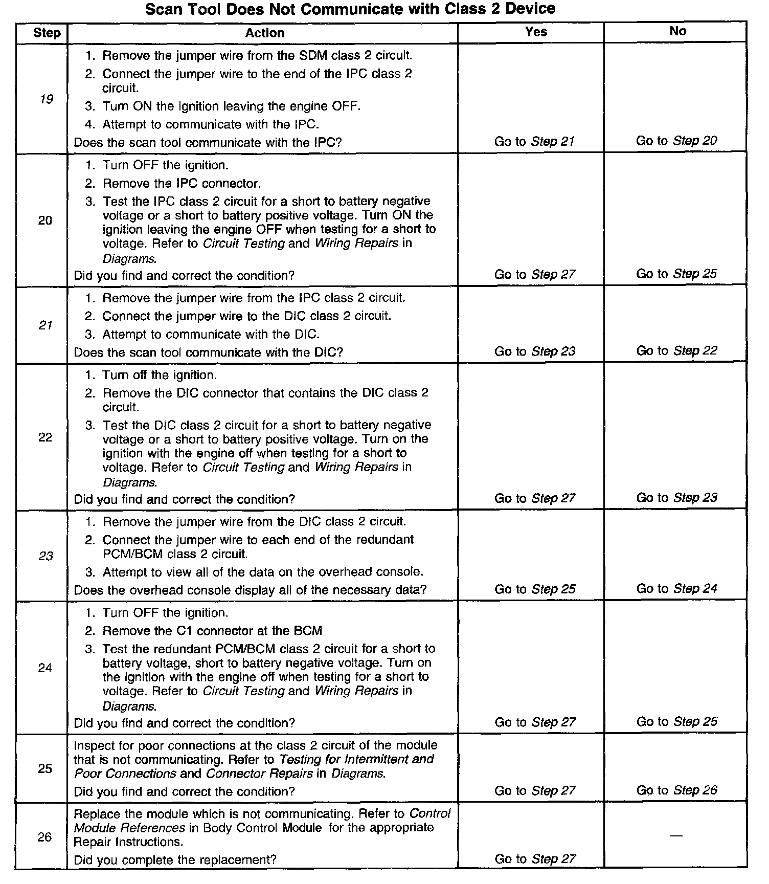 9. The class 2 serial data circuit is shorted to battery positive voltage or battery negative voltage. The condition may be due to the wiring or due to a malfunction in one of the modules. When testing the wiring for a short circuit, make sure there is not a module connected to the wire being tested. This test isolates the BCM class 2 serial data circuit.