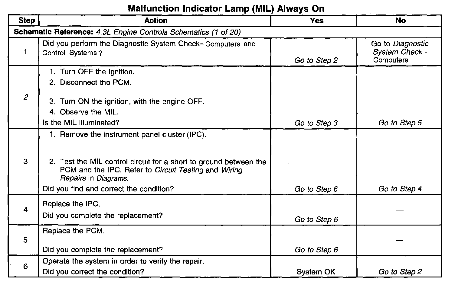 2. This step determines if the condition is with the MIL control circuit or the PCM.