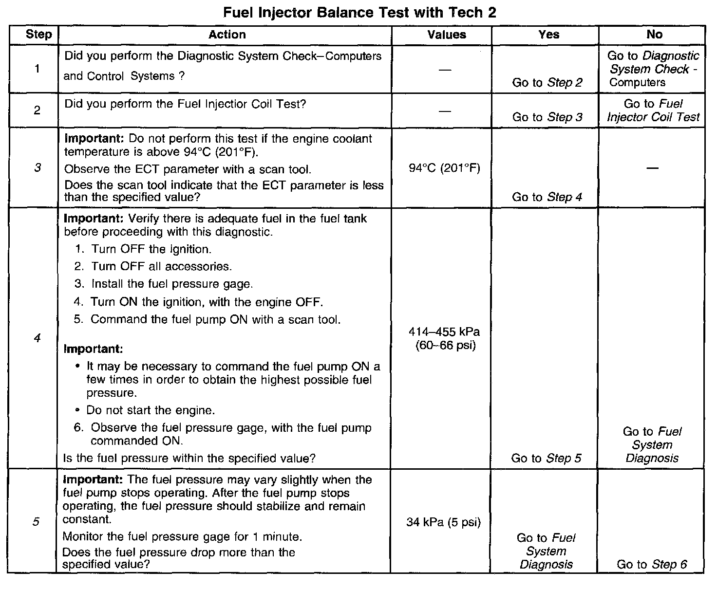 5. The fuel pressure should reach a steady value. Refer to Fuel System Diagnosis if the fuel pressure does not stabilize. Component Tests and General Diagnostics