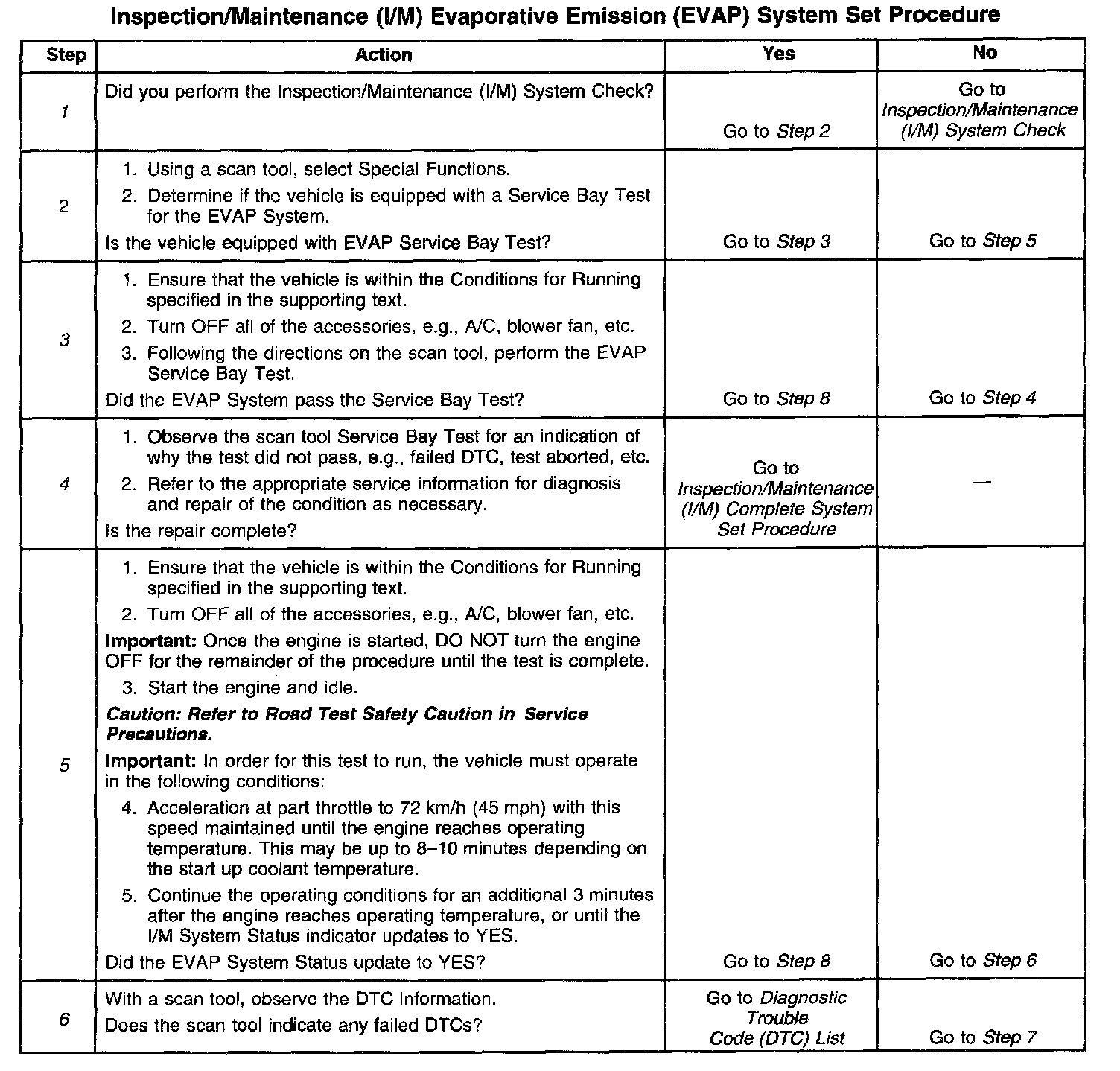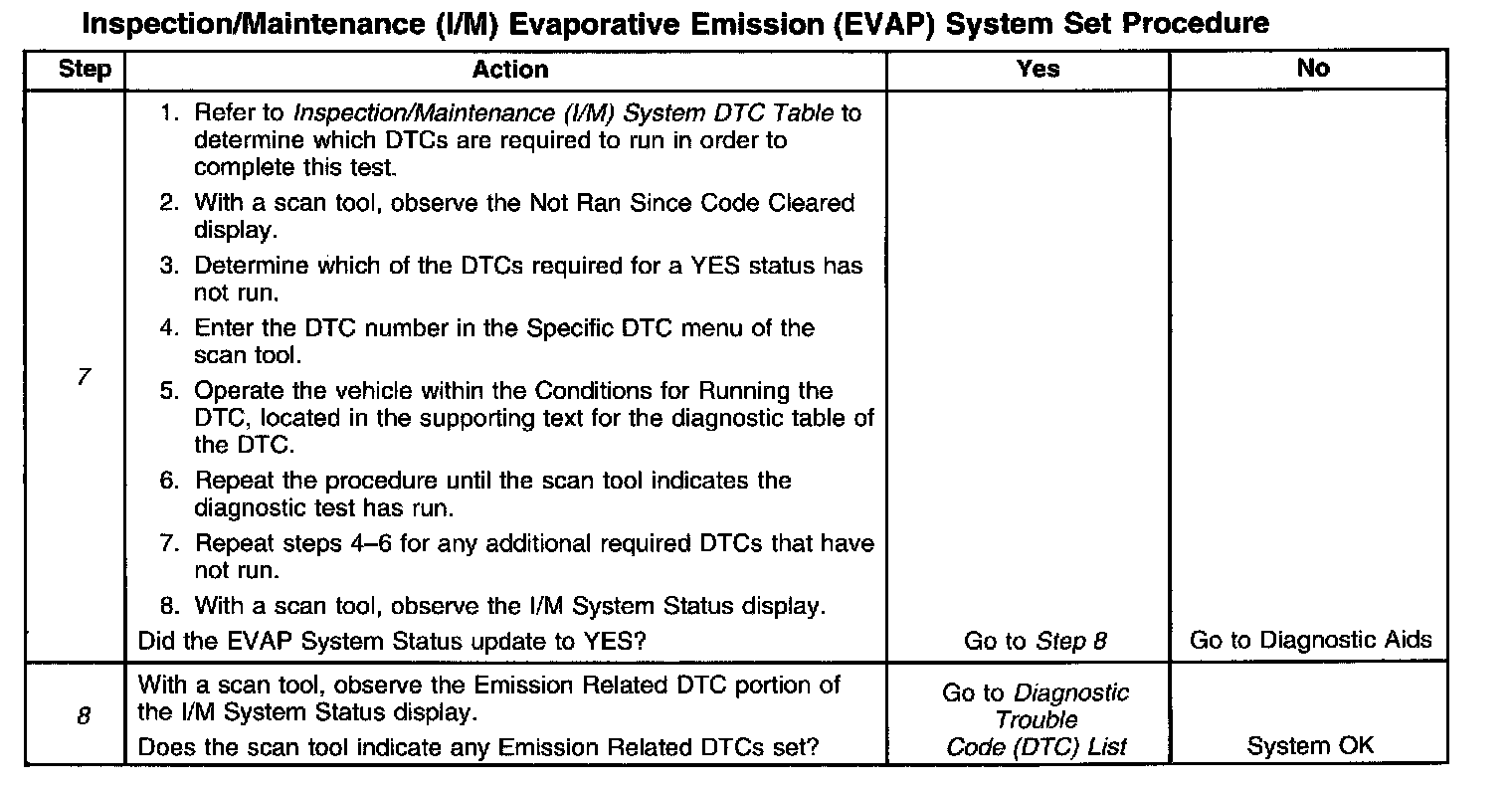 8. The I/M System Status only reports on whether or not a diagnostic has run, not the outcome of the test. If any emission related DTC sets after the tests are complete, the DTC will require diagnosis.