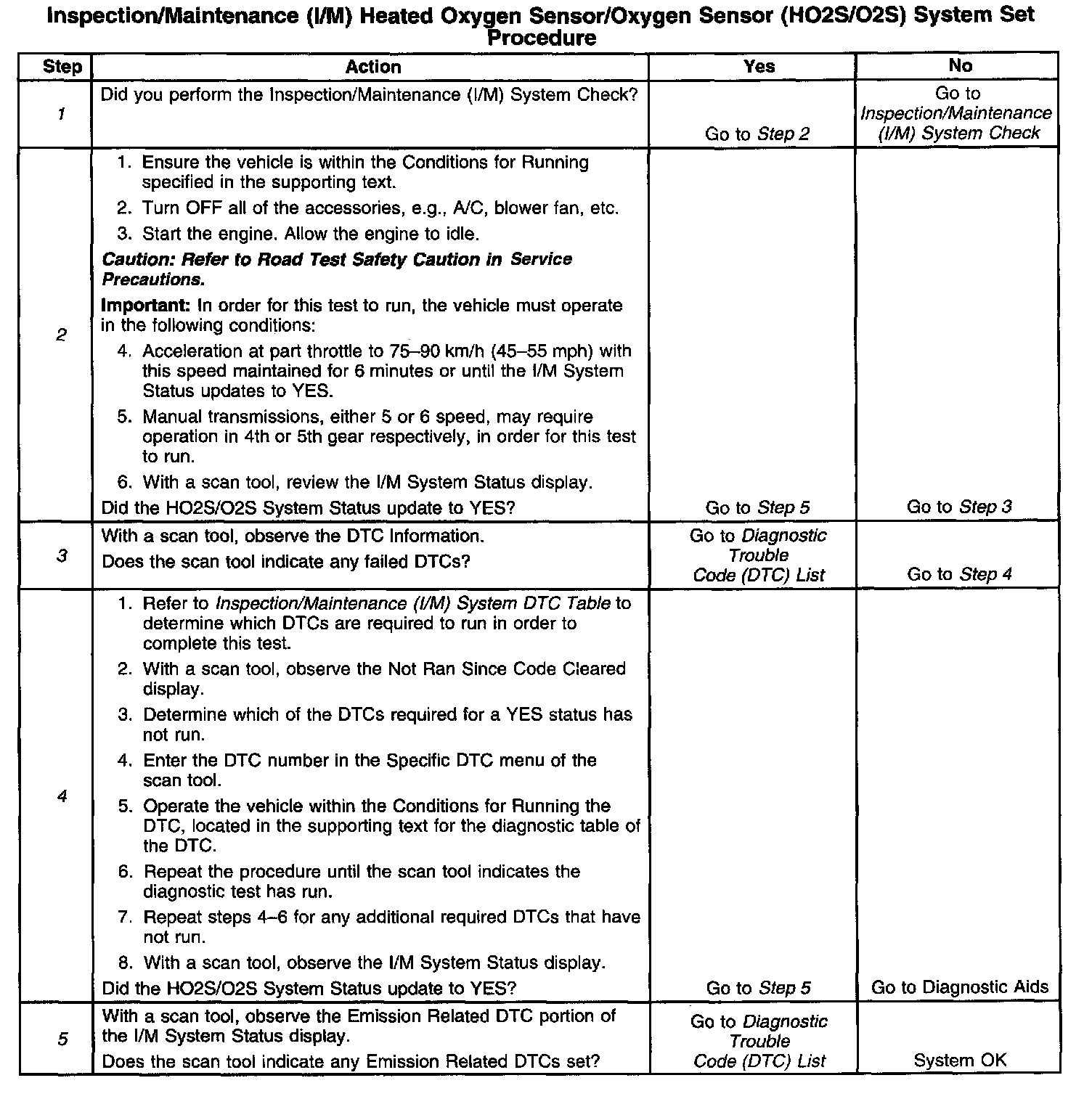 DESCRIPTIONThe purpose of this test is to satisfy the enable criteria necessary to execute I/M readiness diagnostics for the oxygen sensor (O2S, HO2S) system. The test may be used to set the I/M System Status to YES. Ensure the vehicle meets the requirements listed in Conditions for Running before performing this test. Failure to meet the necessary requirements may produce inaccurate test results.