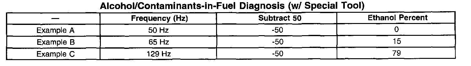 12. Subtract 50 from the reading on the DMM to obtain the percentage of alcohol in the fuel sample. Refer to the examples in the following table.