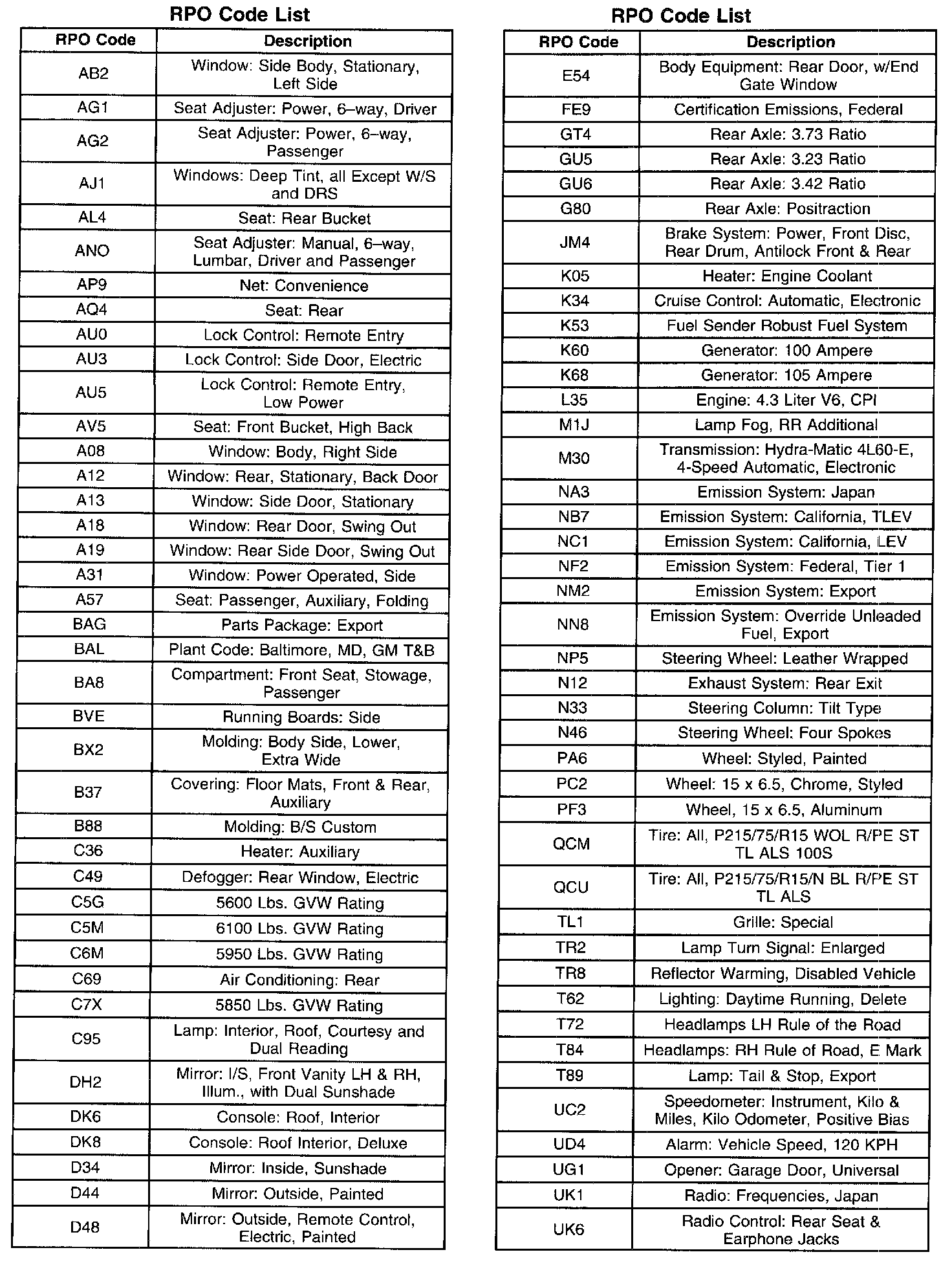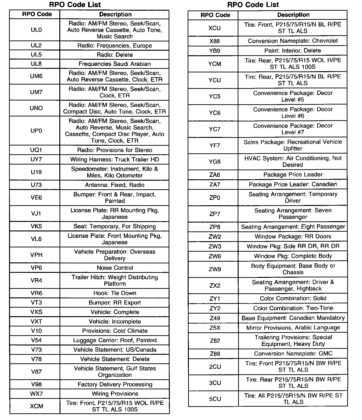 RPO Code List: