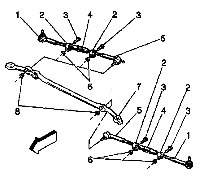 The number of threads on the inner tie rod (5) and the outer tie rod (1) ends must be equal within 3 threads.