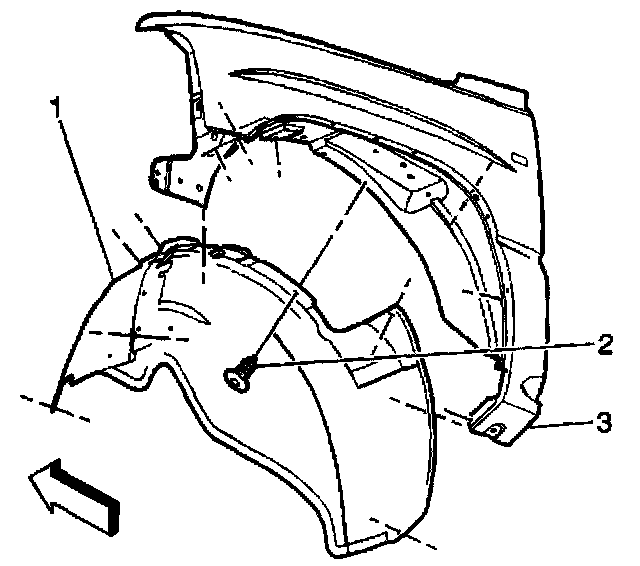 4. Remove the right front fender wheelhouse inner fender (1).