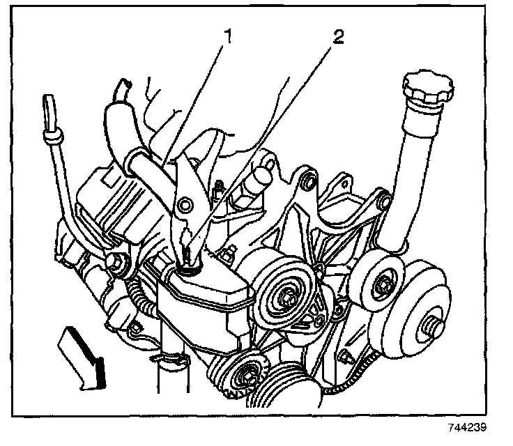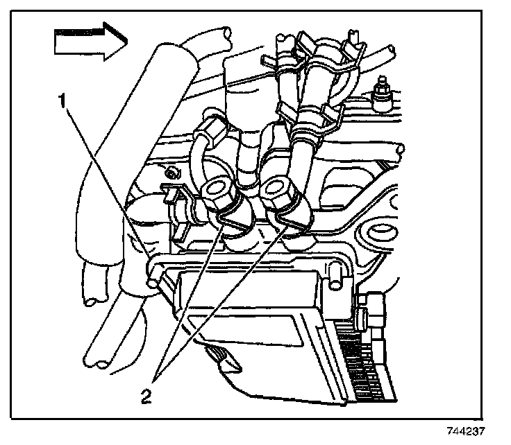 3. Remove the clamp (2) from the PCV hose (1) to PCV oil catch and move the hose aside.