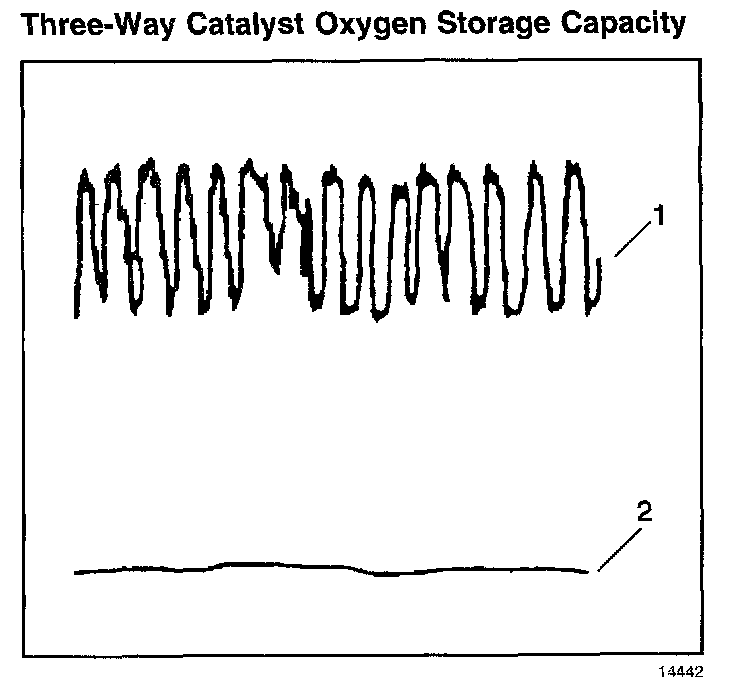 The PCM must monitor the 3-way Catalyst System (TWC) for efficiency. In order to accomplish this, the PCM monitors the pre-catalyst and post-catalyst oxygen sensors. When the TWC is operating properly the post-catalyst (2) oxygen sensor shows significantly less activity than the pre-catalyst (1) oxygen sensor. The TWC stores oxygen during the normal reduction and oxidation process. The TWC releases oxygen during its normal reduction and oxidation process. The PCM calculates the oxygen storage capacity using the difference between the pre-catalyst and post-catalyst oxygen sensor voltage levels.