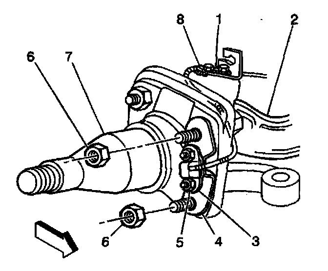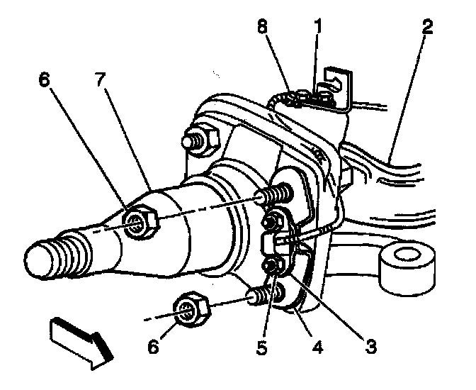 5. Remove the wheel speed sensor wire mounting clip (6) attached to the upper king pin cap.