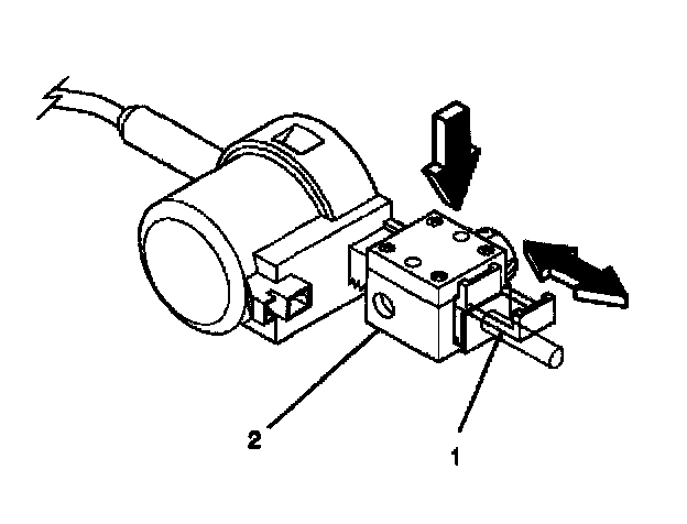 3.2. Press on the adjuster block (2) to compress the internal adjuster spring to disengage the adjuster teeth. Slide the adjuster block as far away from the solenoid as possible.