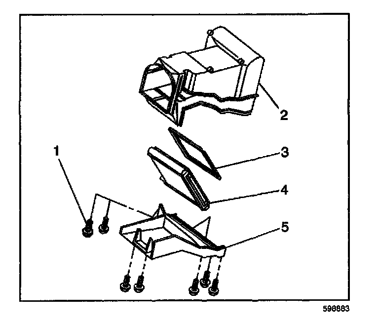 3. Install the 7 screws (1) that hold the heater cover (5) to the heater case (2). Replace the seals.