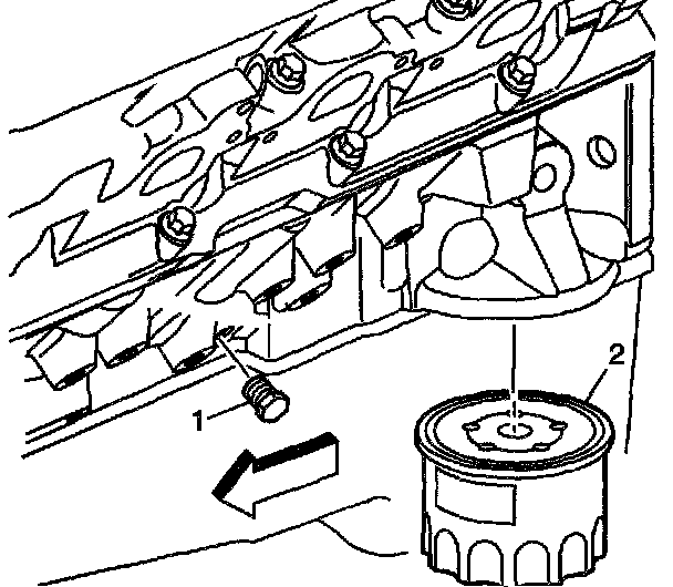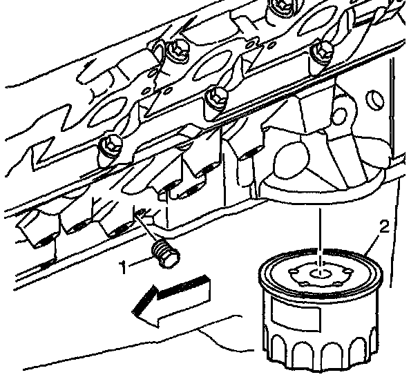 4. Remove the oil filter (2) from the engine block and allow the engine oil to drain completely.