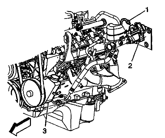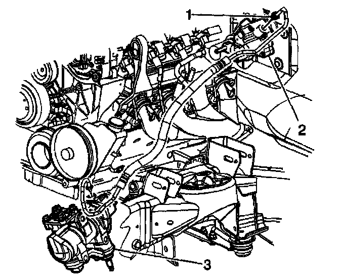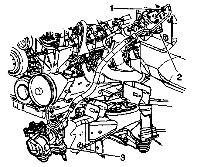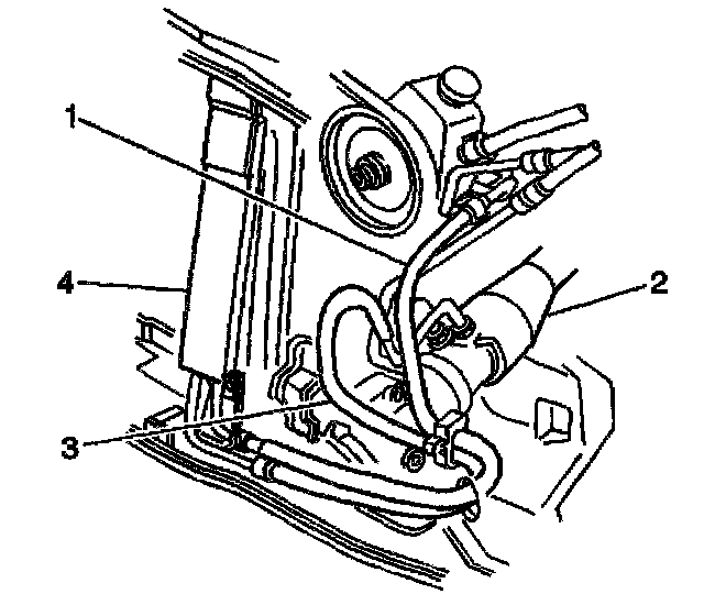 2. Remove the power steering hose (3) fitting from the power steering gear.