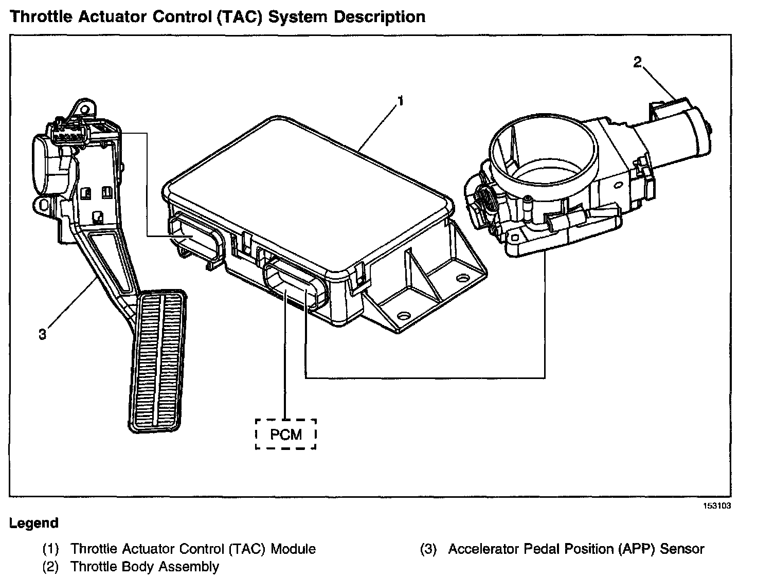 The Throttle Actuator Control (TAC) system uses vehicle electronics and components to calculate and control the position of the throttle blade. This eliminates the need for a mechanical cable attachment from the accelerator pedal to the throttle body. This system also performs the cruise control functions as well.