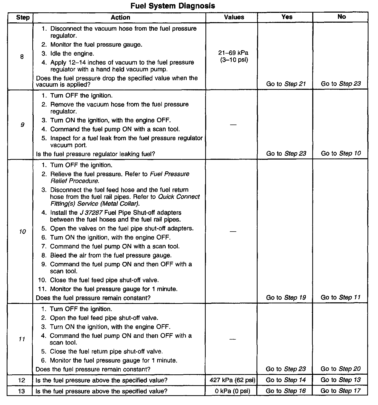 11. This step tests for a leaking fuel injector, or fuel pressure regulator. If the fuel pressure remains constant during this test, the fuel injectors are not leaking fuel.