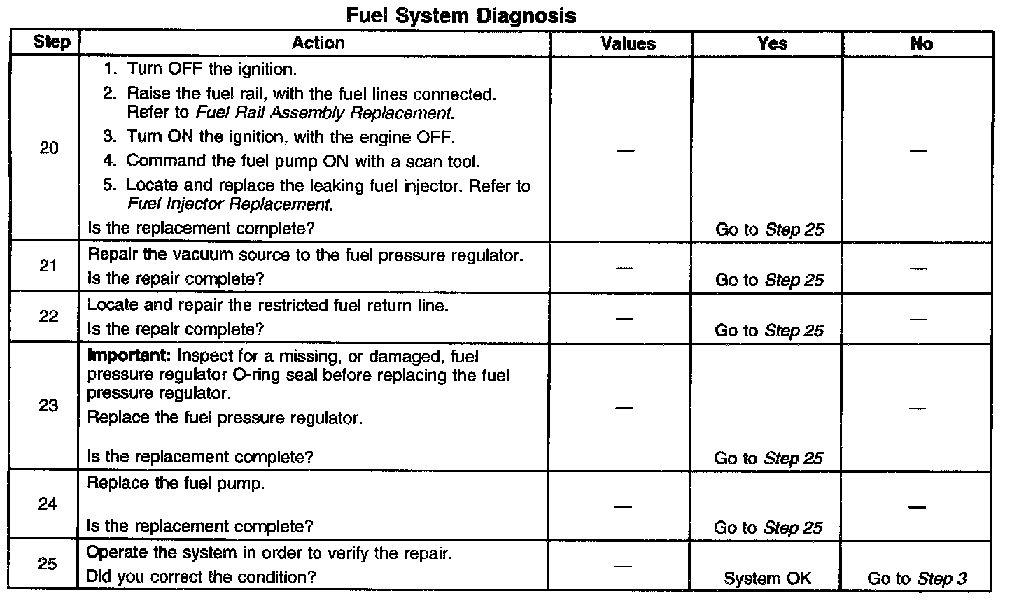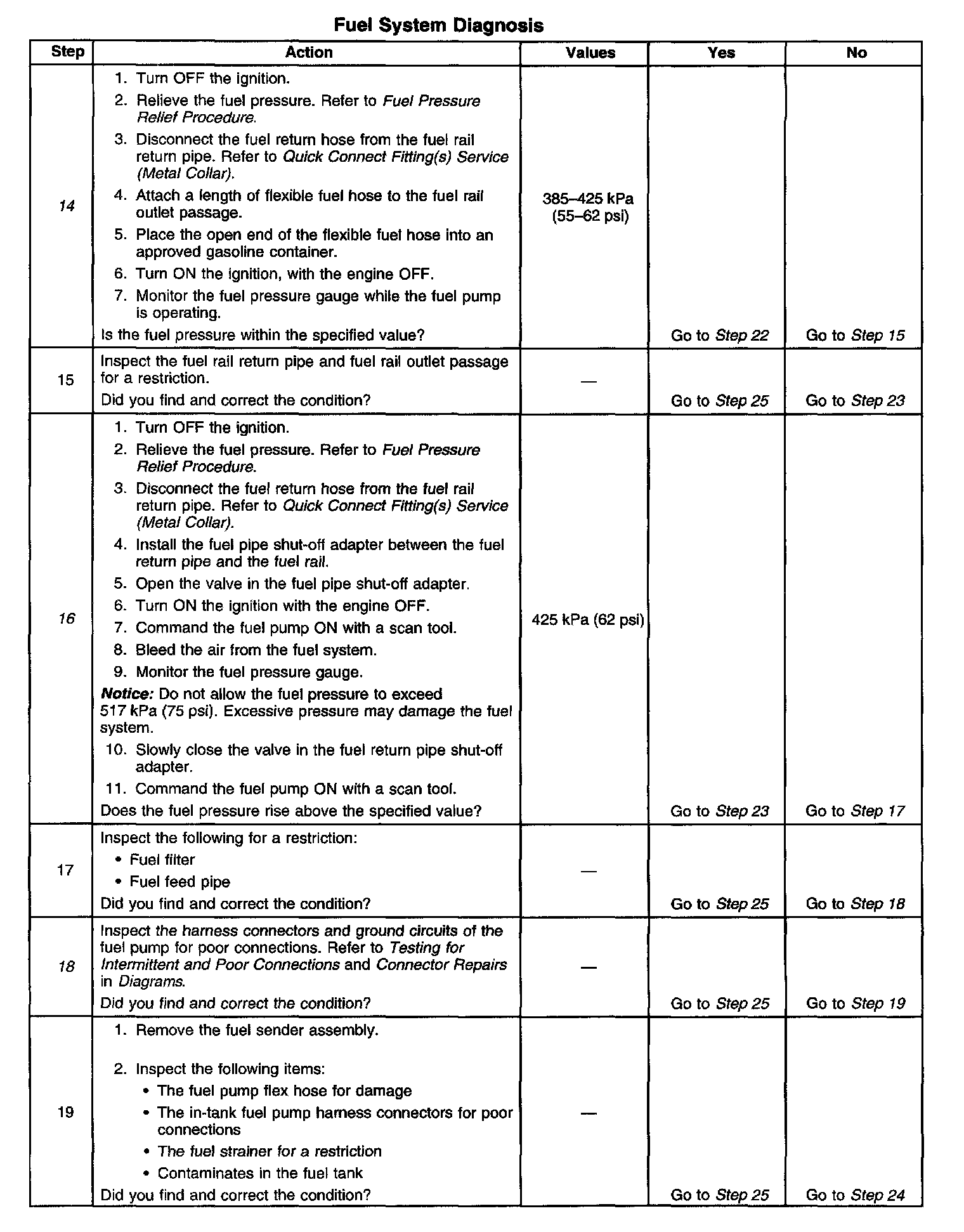 14. This step tests for a restricted fuel return pipe. If the fuel pressure is within the specified values, a restriction in the fuel return pipe is indicated.