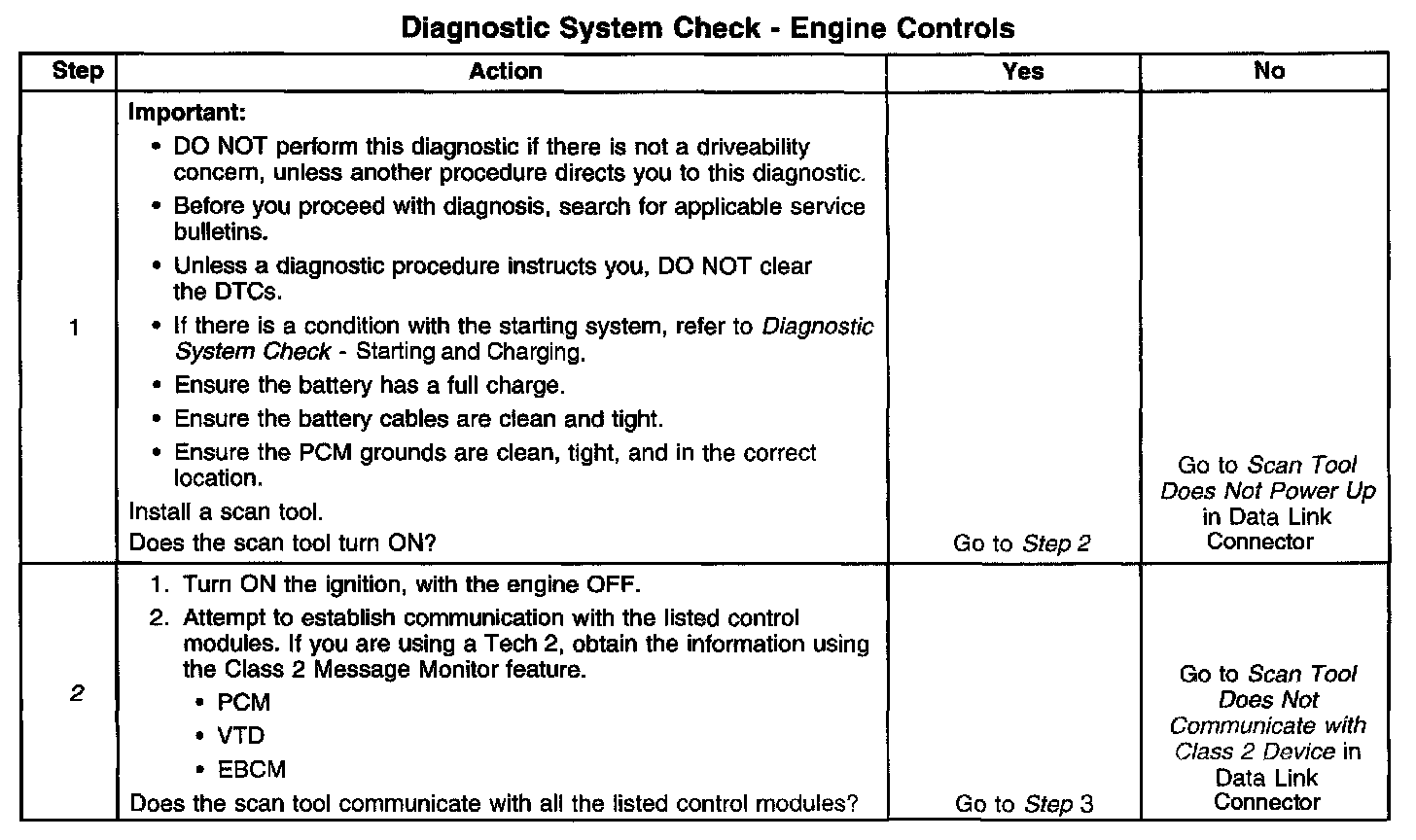 2. Lack of communication may be because of a partial or a total malfunction of the class 2 serial data circuit. The specified procedure determines the particular condition.
