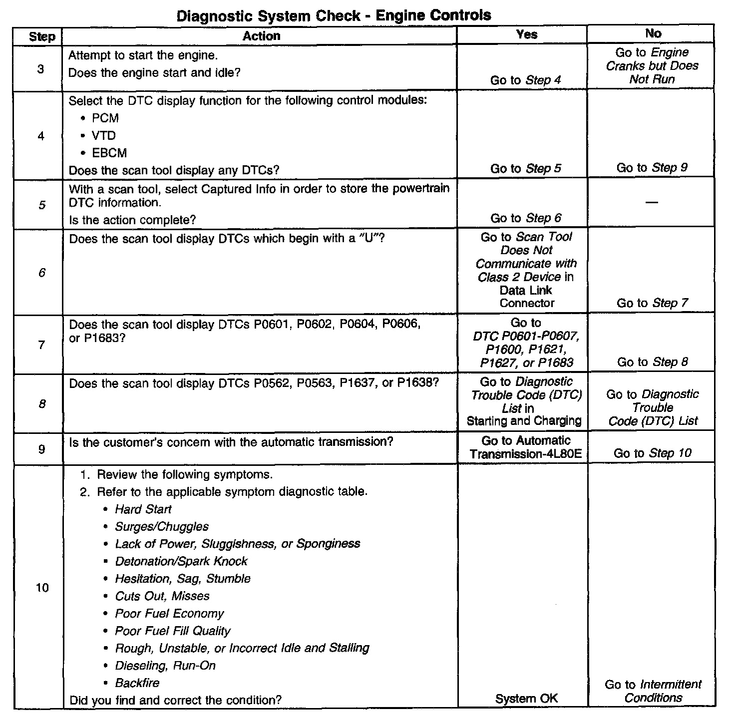The Diagnostic System Check is an organized approach to identifying a condition that is created by a malfunction in the powertrain control system. The Diagnostic System Check must be the starting point for any driveability concern. The Diagnostic System Check directs the service technician to the next logical step in order to diagnose the concern. Understanding and correctly using the diagnostic table reduces diagnostic time, and prevents the replacement of good parts.