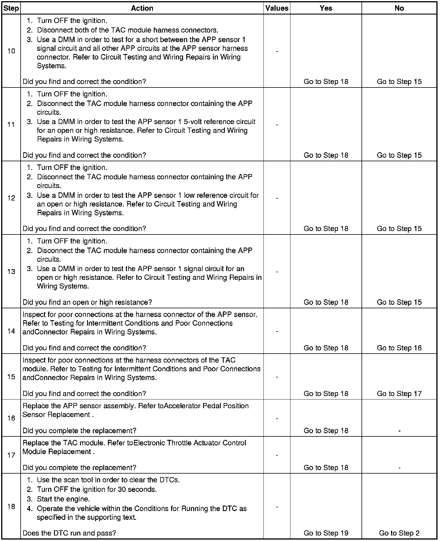 5. This step isolates an internal APP sensor failure. The condition may only occur at a certain accelerator pedal position. Monitoring the APP angles for sensor 2 and sensor 3 is an accurate way of verifying the actual position of the pedal. The APP angles for all 3 sensors should be within a few percent of each other. When the pedal is at rest the APP angle for all 3 sensors should be 0 percent, when the pedal is fully depressed all APP angles should be 100 percent.