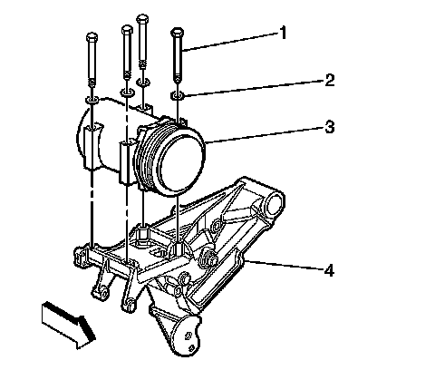 11. Remove the compressor (3) from the drive belt tensioner bracket (4).