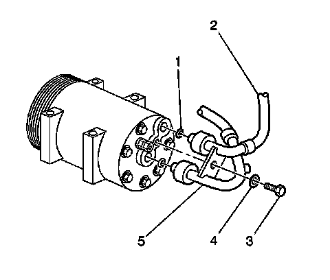 7. Hold the clamp in place. Install the washer (4) and hand tighten the compressor hose fitting bolt (3).
